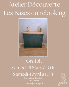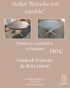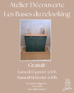 Ce sont des ateliers gratuit durant lesquels vous apprenez les bases du relooking de meubles. Nous ne réalisons pas un meuble durant cet atelier, mais je vous montre les étapes du relooking, les erreurs à éviter et surtout beaucoup d’astuces.