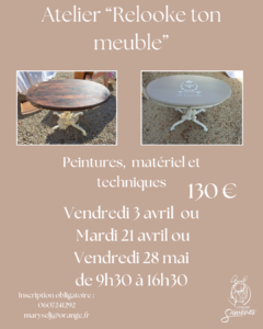 Cet atelier est un atelier à la journée ou sur 3 tranches de 2h. Vous venez à l’atelier relooker votre propre petit meuble, type chaise, chevet, petite table, petite console (nous validons ensemble le support). Durant cette journée, tout le matériel vous est fournis ainsi que les peintures et les conseils bien sûr.